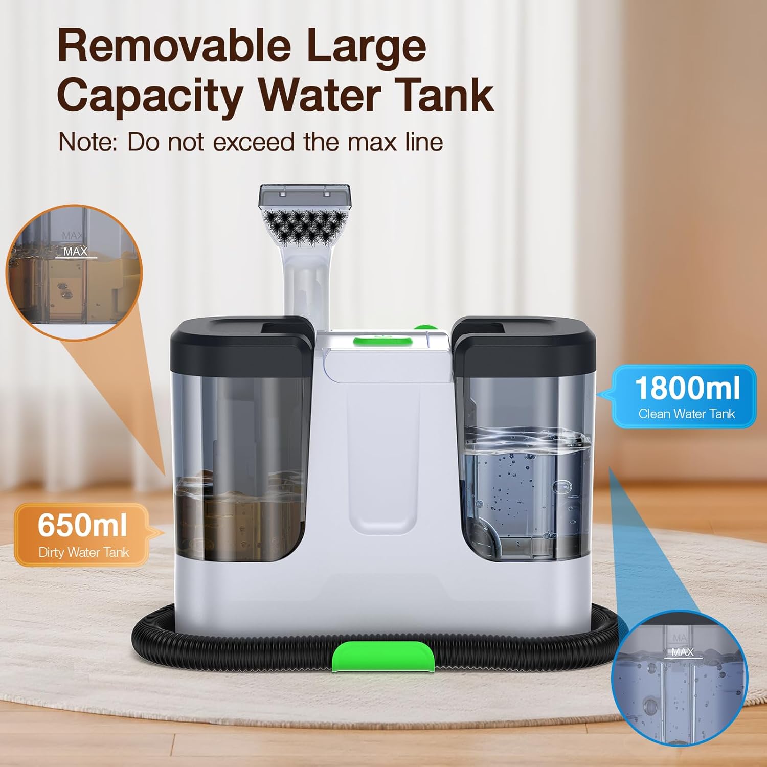 Large Dual Water Tanks: Our portable small carpet cleaner features two independent water tanks: a 1800ml clean water tank, combined with a 650ml dirty water tank, eliminating the need for frequent refills, it allows you to clean your entire home in one go. This split design makes it easy to manage when to refill or empty the waste water tank. (Note: Do not exceed the maximum fill line, as this may reduce suction power.)