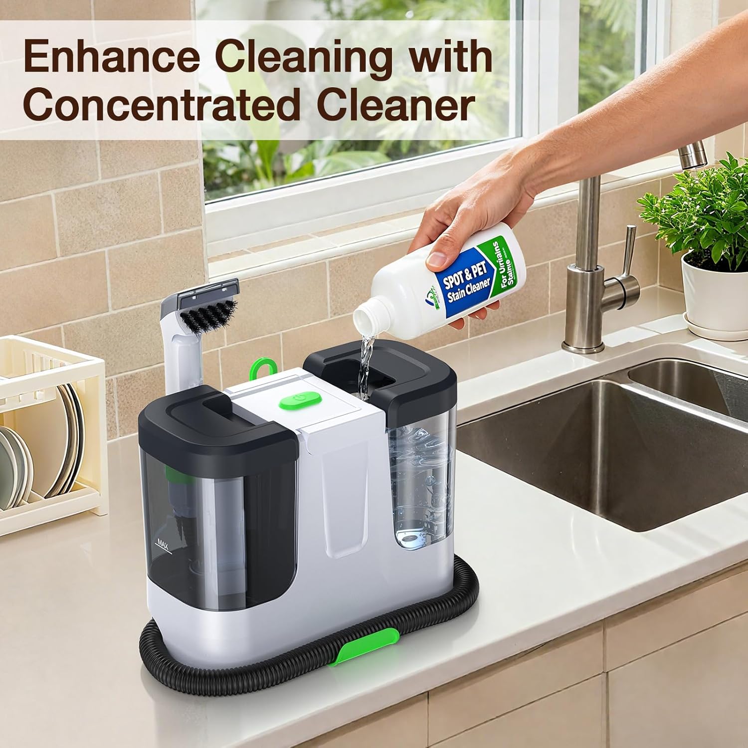 Portable & Easy to Store: This carpet cleaner machine with lightweight design (only 3.68 kg), you can easily carry this spot cleaner to address sudden spills and accidents wherever they happen. The compact body of this carpet cleaner features a dedicated clip that securely attaches the extra-long hose (3.28 FT), power cord (9.84 FT), and brush to the machine. It can be easily hidden under a sink or in a closet corner, eliminating tangled cords and messy tools after cleaning!
